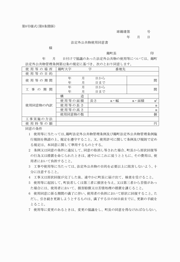 第2条 条例第5条第1項前段の規定による許可を受けようとする者(以下「申請者」という。)は、法定外公共物使用(許可申請・協議)書(第1号様式)に、次に掲げる書類を添付して、使用等をしようとする日の14日前までに、町長に提出しなければならない。