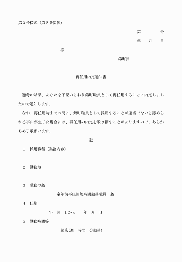 第2条 新たに暫定再任用を希望する者及び暫定再任用の更新を希望する者は、再任用申込書(第1号様式)を町長に提出するものとする。